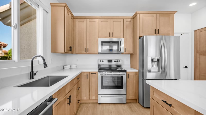 Listing details for 23116 Drifter Way, Sun City West, AZ 85375 : Stunning top-to-bottom remodel in sought-after Sun City West! This 2 bed/2 bath, 1,653 sq ft home has been transformed with designer finishes throughout -- white oak cabinetry, quartz countertops, luxury vinyl plank flooring, fresh paint, and new baseboards. The chef's kitchen features stainless steel appliances, while the fully redesigned master bath and shower deliver a true spa experience. Both bathrooms boast new vanities. Peace of mind comes standard with a 2024 HVAC, windows, and water heater -- plus fully paid-off solar for unbeatable energy savings. Move-in ready and waiting for you to enjoy everything Sun City West's premier amenities have to offer!