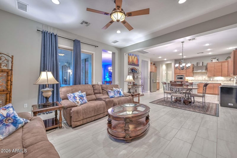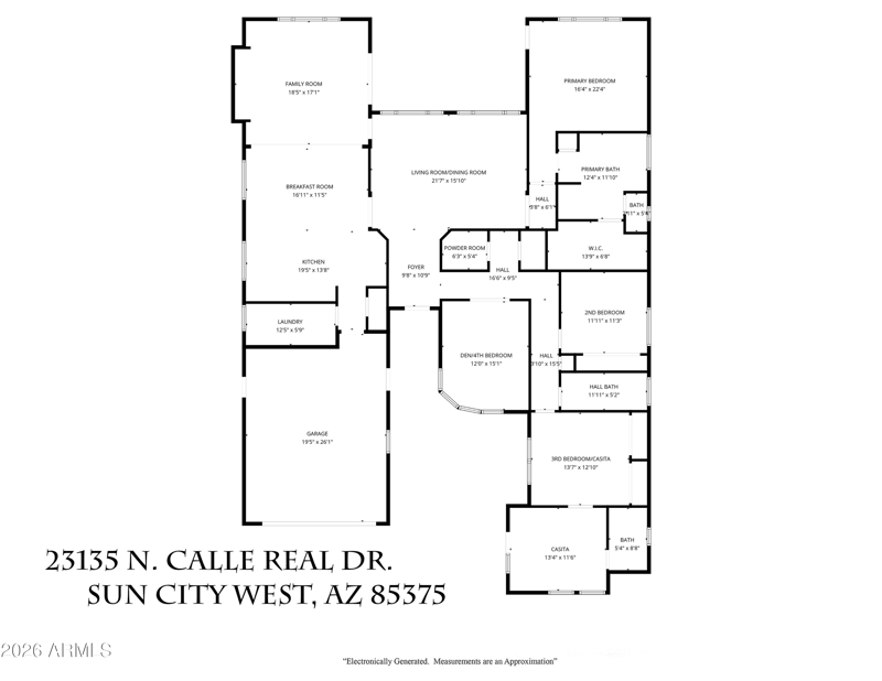 Listing details for 23135 Calle Real Dr, Sun City West, AZ 85375 : Perfectly positioned on a ΒΌ Acre Lot adjacent to a scenic walking path, this residence offers both privacy & tranquility within the prestigious guard-gated Corte Bella Country Club community. From the moment you arrive, the care, quality, and thoughtful upgrades of this exceptional home are immediately evident. A charming gated courtyard creates a warm & inviting entry, setting the tone for the elegance that unfolds inside. Step through the foyer into the Formal Living & Dining areas, where expansive picture windows draw your eye to the beautifully designed backyard, complete with a covered patio, remote-controlled awning, & a striking stone fountain waterfall that creates a peaceful, resort-style ambiance. The heart of the home is the Great Room, where refined comfort meets modern convenience. Enhanced with surround sound & a custom-built-in entertainment unit, it flows seamlessly into the upgraded Kitchen. Here, you'll find exquisite cabinetry with rope detailing & crown molding, under-cabinet lighting, quartz countertops, a generous center island with bar seating, LG stainless steel appliances, & a premium Kraus single-basin sink, every element thoughtfully selected for both beauty & function. The Primary Suite is a private retreat offering dual vanities, a luxurious jetted soaking tub, walk-in shower, & an expansive walk-in closet. Throughout the home, you'll appreciate the abundance of storage & the elevated finishes, including newer porcelain tile flooring in all main living areas, plush carpeting in the bedrooms, & custom window treatments that add warmth & sophistication. Designed with flexibility in mind, the home features a full private Casita with its own entrance, ideal for guests or Multi-Generational Living. The versatile 4th bedroom, complete with a solid wood Murphy bed, easily transitions into an Office or Den to suit your lifestyle. Step outside to a backyard designed for both relaxation and entertaining, featuring a built-in BBQ area, gas fire pit, enhanced landscape lighting, & an updated PVC irrigation system with new valves, ensuring beauty and efficiency year-round. Significant system upgrades provide peace of mind, including two brand-new Trane HVAC units (2026) & a sophisticated CCTV security system installed in 2022, along with an upgraded breaker box and additional electrical sub-panel. With a nod to green technology, this home contains the H2O Concepts Whole House water purification system. Even the garage has been elevated with high-quality built-in cabinetry, workbenches, & a utility sink. Enhancements include iron fencing on the pony wall for additional security and privacy. A spacious laundry room with upper & lower cabinetry, counter space, & a utility sink, along with updated bathrooms featuring new toilets and an upgraded 5/8-inch glass shower door in the hall bath. Energy efficiency is enhanced with fully prepaid solar panels. With over $110,000 in upgrades, this home is a seamless blend of elegance, comfort, and modern efficiency. An exceptional opportunity to enjoy refined living in one of the area's most sought-after communities.