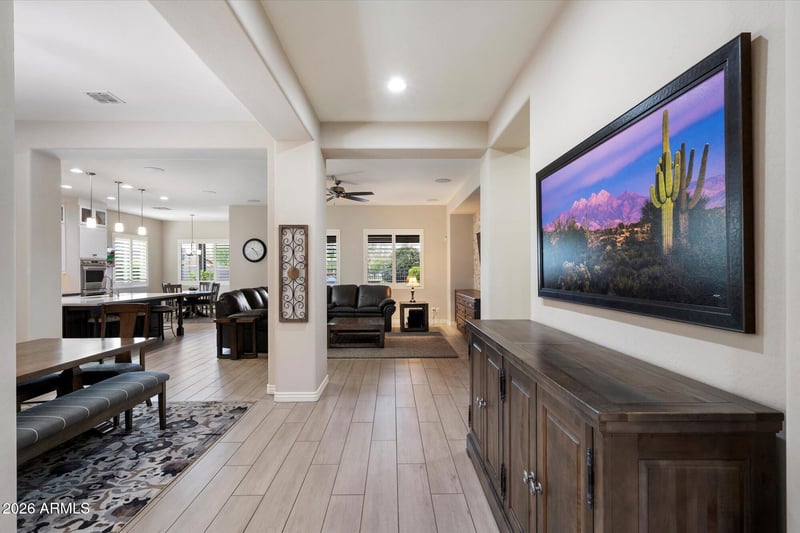 Listing details for 23308 46th St, Phoenix, AZ 85050 : Desert Ridge gem on a rare premier lot backing to a common area park! This beautifully upgraded 2745 square foot home offers exceptional privacy with neighbors on only one side. Some of the upgrades include a 75'' LED TV, 4 other TV's, whole house audio, 8'' outdoor rock speakers, surround sound in family room, RO water filter system, water softener, plantation shutters, custom barn door, custom closet shelving in master closet and office, patio awnings and SO much more. Enjoy abundant natural light, and an ideal layout for everyday living and entertaining. Experience this quiet, open setting rarely found in this community. Conveniently located near shopping, dining, golf, top rated schools and freeway access. This baby is going to sell FAST, don't miss your opportunity!!
