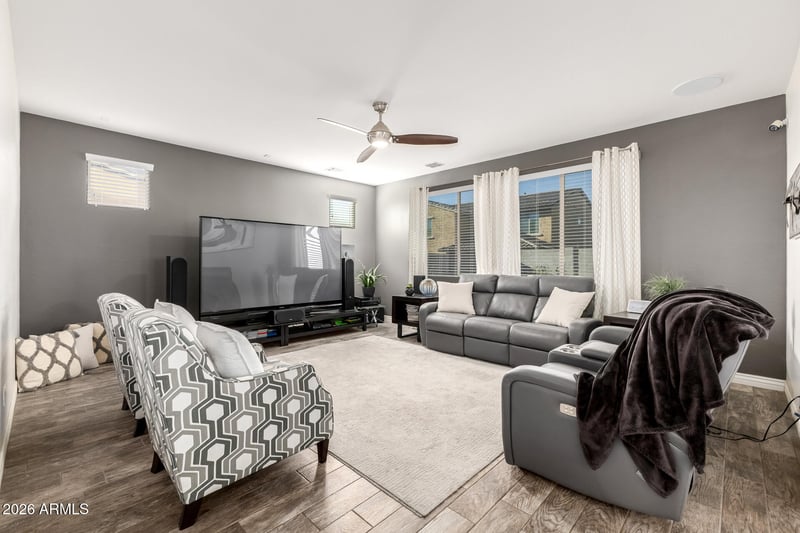 Listing details for 2398 Hazeltine Way, Gilbert, AZ 85298 : Your new home is here in Adora Trails! Discover a bright living room w/ high ceilings, a formal dining room perfect for hosting special gatherings, and a cozy family room for intimate gatherings, Downstairs office/den is a bonus space! The eat-in kitchen has granite counters, plethora of cabinetry, stainless steel appliances, a large island with a breakfast bar, & walk-in pantry. Upstairs, 3 Bedrooms plus the gorgeous main suite provides direct access to a serene balcony, a generous walk-in closet, and a large walk in shower. A versatile loft has been thoughtfully converted into a movie room , creating the ultimate space for entertainment! Backyard has built in firepit and planters with low maintenance DG. COMMUNITY POOL, GYM, TRAILS. TOT LOT, CATCH AND RELEASE IN HOA dues! Don't miss!