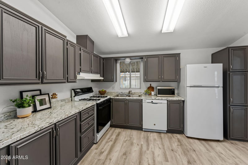 Listing details for 2401 Southern Ave #155, Tempe, AZ 85282 : SELLER WILL COVER THE BUYER'S FIRST TWO MONTHS OF LOT FEES - an amazing opportunity to enjoy life in one of Tempe's desirable 55+ gated communities! This beautifully updated 2-bedroom, 2-bath home blends comfort and convenience with great curb appeal, covered parking, and side parking perfect for your golf cart. Inside, you'll find a light-filled open floor plan with vaulted ceilings, wood-look flooring throughout, and a fresh neutral palette. Two spacious living areas offer flexibility for entertaining, relaxing, or a home office setup. The kitchen features ample counter space, grey cabinetry, and built-in appliances ready for everyday meals or hosting friends. The primary suite is a private retreat with dual sinks and its own bath. Enjoy low-maintenance living (MORE) with a full carport, large storage shed, and convenient access to community parking -- all in the heart of Tempe near shopping, dining, and freeways. Come experience the vibrant lifestyle this gated community offers. Hurry!