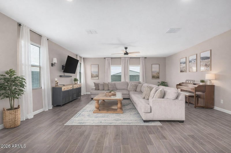 Listing details for 24109 Ripple Rd, Buckeye, AZ 85326 : Seller offering 5% in concessions, plus furniture and appliances shown are included! This beautifully designed home offers 3 bedrooms, 3 bathrooms, and a den, combining comfort, style, and exceptional value. The light-filled interior features a neutral color palette, wood-look tile flooring, and upgraded carpet in the bedrooms, creating a warm and inviting atmosphere throughout.