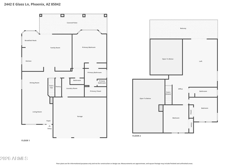 Listing details for 2442 Glass Ln, Phoenix, AZ 85042 : Experience resort-style living in the gated, upscale Fairways at The Legacy community, perfectly positioned on the Legacy Golf Course in Phoenix. This spacious home welcomes you with soaring ceilings and an abundance of natural light, enhanced by new HVAC systems installed in March 2024, offering energy-efficient comfort and peace of mind. The main level features an inviting living room and a wide-open family room that flows seamlessly into the beautifully appointed kitchen, complete with granite countertops, stainless steel appliances, and a breakfast nook—ideal for both everyday living and entertaining. The primary suite is conveniently located on the main floor, providing a private retreat with exceptional comfort. Upstairs, enjoy an expansive loft with a private balcony showcasing breathtaking views, along with two additional bedrooms that offer flexibility for guests, work-from-home space, or family needs. Step outside and prepare to be impressed. The backyard is a true private oasis, featuring a sparkling, easy-to-maintain saltwater pool, panoramic golf course views, and plenty of space for outdoor dining, relaxation, and entertaining. This is Arizona living at its finest.