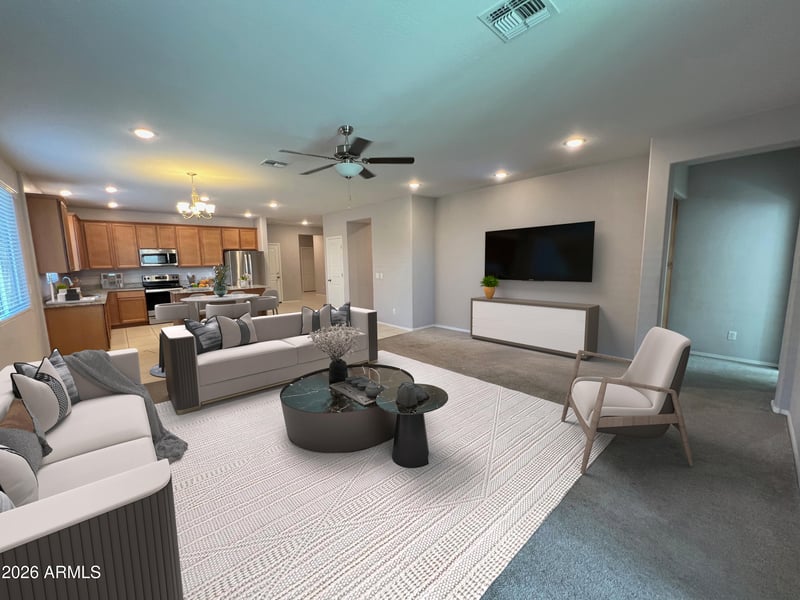 Listing details for 24749 Jessica Ln, Buckeye, AZ 85326 : FHA 2.675% assumable loan w/ qualifying. This Energy Star-rated home features an open floor plan, 9ft ceilings, 11K in upgrades, and a rock landscaped backyard. Kitchen includes 42'' upper cabinets, granite countertops, pantry, and island. Master suite has walk-in closet, dual sinks, separate shower, and garden tub. Four bedrooms include split master plus guest/office with walk-in closet. Window coverings, ceiling fans, extra recessed lighting, looped for soft water. Refrigerator and washer/dryer included. Screened extended patio. Carpet allowance $3,500. *****Virtually staged to showcase furniture placement and room potential*****