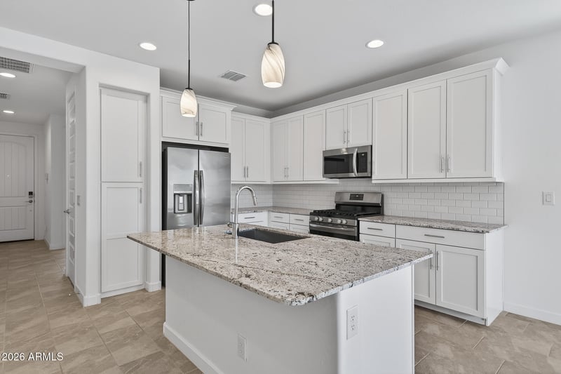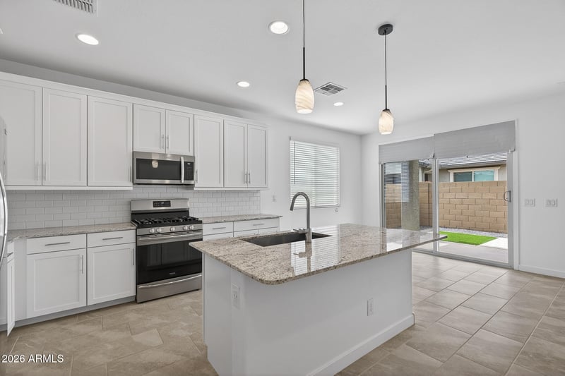 Listing details for 24870 171st Ln, Surprise, AZ 85387 : Welcome to this well-maintained 2-bedroom, 2-bath home featuring a modern kitchen with beautiful cabinetry, stainless steel appliances, granite countertops, and a breakfast bar island. The primary suite includes a walk-in closet and an ensuite with dual sinks and a large shower. Enjoy a low-maintenance backyard with artificial grass, rock landscaping, and a spacious covered patio. This home is a perfect winter getaway or full-time AZ residence.