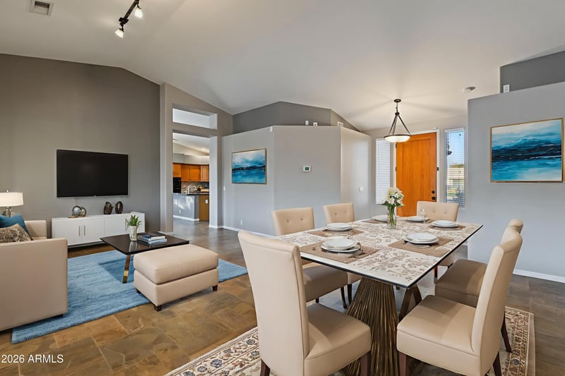Stone flooring enhances the main living areas, with plush carpet in the bedrooms. Vaulted ceilings and a soaring great-room entry welcome you through a custom iron front screen door. The chef's kitchen is a true standout with quartz countertops, sit-up island, stainless steel appliances, gas cooktop, and wall oven/microwave, Dishwasher and refrigerator all included.