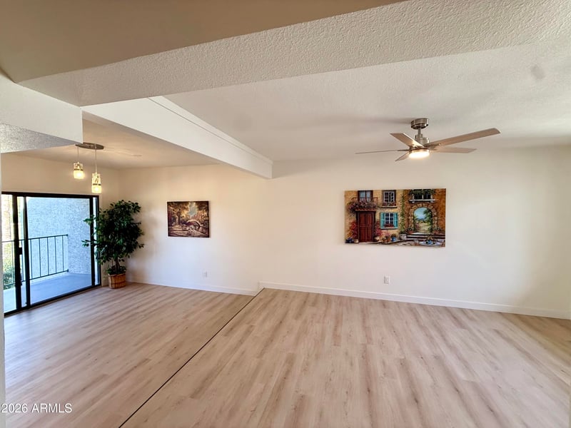 Listing details for 2524 El Paradiso Dr #57, Mesa, AZ 85202 : Step into a lifestyle of comfort and convenience in this beautifully renovated townhome. The updated kitchen features new cabinetry, modern appliances, and sleek quartz countertops, complemented by refreshed bathrooms and luxury vinyl flooring throughout. This thoughtfully designed dual-suite floor plan offers privacy and flexibility, along with charming details like exposed wood beams and a private courtyard. Enjoy relaxing or entertaining on the waterfront patio with serene golf course views. The spacious downstairs bonus room provides endless possibilities--perfect for a media room, home gym, or entertainment space--plus ample storage throughout.