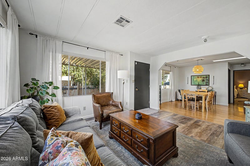 Listing details for 2535 Oraibi Dr, Phoenix, AZ 85050 : Set on owned land with no HOA, this doublewide manufactured home offers a rare combination of flexibility and function. The north-south orientation brings in consistent natural light, giving the home a bright, easy livability throughout the day. Inside, the layout is generous where it matters most. A spacious living and dining area creates a natural gathering space, while the kitchen is well-equipped with ample storage and an adjacent bonus area that adds everyday convenience. Currently used as overflow pantry but could be an office or play room. The primary suite is thoughtfully arranged with a walk-in closet, dual sinks, and a private bath and shower room, creating a sense of separation and comfort. Outside, the property continues to deliver. Two extended-length carports provide plenty of shade for entertaining, covered parking, and the backyard includes two storage sheds--one of which is air-conditioned, offering a versatile space for a workshop, studio, or additional storage. This beautifully maintained home offers the kind of usability that's getting harder to find--no HOA, owned land, and room to make it your own. Ideally located near the 101 and 51 with easy access to shopping, groceries and entertainment.