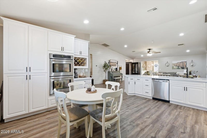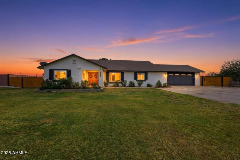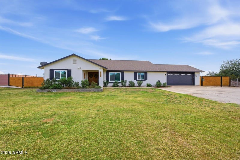 Listing details for 25437 Pueblo Ave, Buckeye, AZ 85326 : Welcome to Northwood Park Estates - Where Space, Style & Freedom Come Together. Situated on a rare 1.007 irrigated acre lot in the highly sought-after Northwood Park Estates subdivision, this beautifully remodeled 5-bedroom, 3-bath home offers the perfect blend of modern comfort & country charm. From the moment you arrive at the quiet cul-de-sac lot, you'll appreciate the expansive lawn, mature trees, RV gate with dedicated RV hookup, & room for horses. The irrigated lot, fruit trees, & wide-open space create the lifestyle so many buyers are searching for. Step inside to discover a thoughtfully remodeled interior featuring luxury wood-look flooring, designer finishes, & a light-filled open layout. The stunning kitchen boasts crisp white cabinetry, quartz countertops, stainless steel appliances, double ovens, a wine rack, & a breakfast bar that flows seamlessly into the dining and living spaces. The inviting family room showcases a custom built-in entertainment center and cozy fireplace -- perfect for gatherings. A separate dining room with statement wallpaper & barn doors adds character and flexibility for entertaining or multi-use space. The spacious primary suite is a true retreat with backyard views, a beautifully updated bathroom featuring dual vanities, marble countertops, designer mirrors, & a striking walk-in shower with black-framed glass. With 5 generously sized bedrooms & 3 remodeled bathrooms, there is room for everyone -- whether you need guest space, a home office, or multi-generational living. Additional highlights include: Owned solar for energy efficiency, RV gate & parking, Horse privileges, Irrigation rights, Mature fruit trees, Remodeled throughout, Large covered patio overlooking lush green lawn. This is the rare opportunity to own over an acre in one of the area's most desirable subdivisions -- with modern updates already done for you. Homes like this don't come around often.