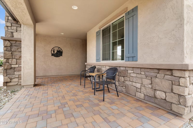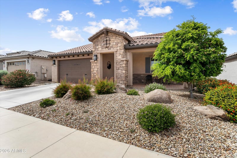 Listing details for 26128 Rosemonte Dr, Buckeye, AZ 85396 : YOUR DESERT HIDEAWAY WITH OWNED SOLAR AND 4 FT EXTENDED GARAGE AWAIT YOUR ENJOYMENT! Enter this thoughtfully designed floorplan w/neutral tile and carpet, designer lighting & window treatments throughout. The Inviting gathering space showcases media wall w lighting and plenty of room for dining. A chef's kitchen featuring upgraded cabinet layout, custom backsplash, walk in pantry, & huge Island w/ pendant lights & seating. An Owners suite complete with a bay window, adjoining bath w/dual sinks, step in shower & large walk-in closet. The light & bright 2nd bedroom w/adjacent full bath is perfect for visitors. The extended garage & additional storage room are climate controlled. Enjoy outdoor living on your extended paved patio overlooking the beautifully landscaped, fenced backyard.