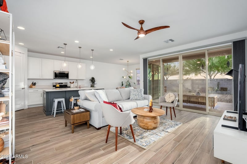 Listing details for 26440 Thornhill Dr, Peoria, AZ 85383 : Rare opportunity! This modern desert home sits on a premium corner lot with no rear neighbors. Enjoy unobstructed mountain views and Arizona's famed sunsets. High end upgrades throughout the open concept floor plan. Highlights include a generous kitchen island that opens up to a sunny dining room and great room, 3 generously sized bedrooms (Primary comes with walk-in shower and closet), 2 full baths and guest powder room. Designer touches and understated decors throughout including Minka ceiling fans, top of the line LG appliances, professional grade water softener, and custom blinds. 4 panel sliding glass door leads to an outdoor oasis. Professionally designed and landscaped backyard serves as a low-maintenance retreat, that's also perfect for outdoor living/entertaining. Property is near popular outdoor recreation including neighborhood hiking trails and Lake Pleasant. Close proximity to entertainment-State Farm stadium, major shopping centers, restaurants, and cafes. In top 10 Peoria school district.