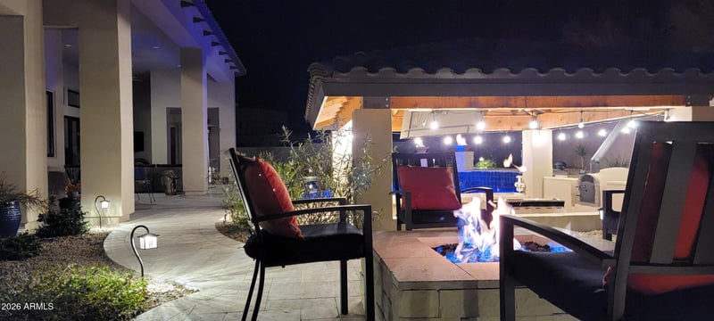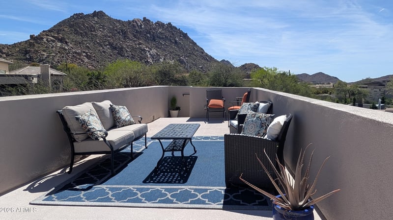 Listing details for 26475 106th Way, Scottsdale, AZ 85255 : Framed by dramatic Troon Mountain and Pinnacle Peak views, this exceptional single-level contemporary luxury estate in guard-gated Windy Walk Estates delivers the ultimate North Scottsdale lifestyle. Situated on an expansive private cul-de-sac lot, the home offers resort-inspired living, premium modern luxury finishes, smart home technology, dramatic architecture with no interior steps, and breathtaking mountain and sunset views. This custom home built in 2020, with 4 bed, 3.5 bath, 2 offices plus bonus room, showcases a stunning open-concept great room with soaring ceilings, dramatic fireplace, and expansive glass doors that frame the surrounding mountain landscape and spectacular Arizona sunsets. Throughout the main living areas, tumbled travertine flooring in an elegant Versailles pattern adds warmth, character, and timeless desert style. The gourmet chef's kitchen is designed for both entertaining and everyday living, featuring custom cabinetry, leather-textured granite countertops, an oversized island, walk-in pantry, with and professional-grade Thermador appliances including double wall ovens, 48" gas range and convenient plumbed built-in coffee bar. A breakfast room and bar seating complement the formal dining area highlighted by a striking climate-controlled wine room with iron and glass door and 700+ bottle capacity. A well-appointed butlers pantry/prep area with wet bar and wine fridge further enhance the home's entertaining capabilities. The private primary retreat offers a luxurious sanctuary with sitting area, spa-inspired bath, freestanding soaking tub, dual vanities, expansive custom walk-in closets, and a spectacular oversized walk-through shower with dual entry and floor-to-ceiling designer tile. The primary suite also enjoys its own private patio with fire pit and stunning Pinnacle Peak views - an inviting space for quiet mornings or sunset evenings. Guest accommodations are equally impressive. One wing of the home features a separate attached guest suite designed as a private retreat, complete with its own living room, mini refrigerator, sink, private entrance, luxury upgraded en-suite bath, and walk-in closet. Large windows frame beautiful views of Pinnacle Peak, creating an ideal space for extended stays, multigenerational living, or a private retreat. Two additional guest bedrooms feature a Jack-and-Jill luxury en-suite bath and share a flexible bonus lounge area ideal for a media space or secondary living room. Both bedrooms enjoy direct access to the pool and patio, enhancing the home's seamless indoor-outdoor lifestyle. The home also includes two private offices or dens, perfect for today's work-from-home lifestyle. One office features custom built-in cabinetry and space designed for a safe, providing both functionality and security. Step outside to a resort-style backyard designed for unforgettable entertaining. A shimmering Pebble Sheen saltwater pool with Baja shelf, swim-up bar seating, cascading water features, and dramatic fire elements creates a stunning focal point against the mountain backdrop. Expansive covered patios provide inviting outdoor living spaces overlooking the pool and Troon Mountain beyond. A show stopping sunken ramada outdoor kitchen features built-in BBQ, professionally constructed pizza oven, TV and bar seating--perfect for entertaining under the Arizona sky. Travertine patios, lush desert landscaping, citrus trees, and custom lighting complete the private desert oasis. Elevating the experience even further is a rooftop view deck offering panoramic views of Troon Mountain, Pinnacle Peak, and distant city lights, plumbed for a gas fire pit--an ideal setting for sunset gatherings or stargazing. This extraordinary home is further enhanced by Savant smart home automation controlling lighting, climate, pool, fireplace, appliances, HVAC, entry camera, and more, along with whole-house audio and integrated CAT6 and Araknis wireless mesh network wiring. Remote-control motorized shades, water softener, reverse osmosis system, over 16 TV locations and multiple HVAC zones add convenience and comfort throughout the home. The residence is also built for performance and energy efficiency with spray foam insulation for exceptional quiet and thermal efficiency. The insulated 3 car garage with oversized bays offers epoxy floors, extensive custom cabinetry, insulated doors and walls, added storage area and 60amp Level 2 EV charging capability. A well-designed laundry room offers custom cabinetry, generous workspace, sink, refrigerator, and a dedicated dog wash and shower area designed for effortless pet care and everyday convenience. Located in one of North Scottsdale's most coveted communities, Windy Walk Estates offers privacy and prestige just minutes from Troon Country Club, world-renowned golf, hiking trails, fine dining, and luxury shopping. A rare opportunity to experience elevated desert living with breathtaking views in the heart of Troon Village.
