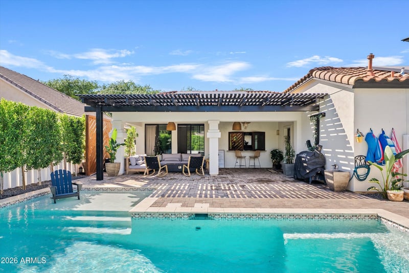 Listing details for 2662 Valencia St, Gilbert, AZ 85296 : Welcome to Agritopia--one of the Southeast Valley's most beloved communities where charm, connection, and lifestyle come together in all the best ways. Picture morning walks along tree-lined streets, evenings at local favorites, and weekends enjoying the neighborhood farm--this is the kind of place people dream about calling home. This beautifully remodeled 3-bedroom, 2-bath home delivers the perfect mix of modern style and everyday comfort. Step inside to a bright, open layout filled with thoughtful upgrades, from the inviting living spaces to the stunning kitchen featuring stylish cabinetry, upgraded finishes, expanded storage, and a dedicated coffee and beverage bar--perfect for entertaining or slow mornings at home. Custom touches like wood beam accents, updated lighting, and new windows elevate the space while keeping it warm and welcoming. The spacious primary suite feels like a private retreat, complete with a reimagined spa-like bathroom featuring custom details, upgraded fixtures, and a beautifully designed shower with an architectural arch. The secondary bathroom has been completely transformed with designer finishes, while additional bedrooms offer flexibility for guests, a home office, or whatever your lifestyle needs. Step outside and you'll find a backyard designed for true Arizona living. Whether you're hosting friends or enjoying a quiet evening, this space has it all--a sparkling pool with heat pump, relaxing hot tub, pergola-covered lounge area, paver patio and pathways, lush landscaping with fruit trees, garden beds, and even a charming chicken coop. Added features like a misting system, vinyl fencing, and a custom privacy wall make this outdoor space as functional as it is beautiful. The upgrades continue with a fully reimagined laundry room featuring custom cabinetry, designer finishes, and a new tankless water heater with filtration system. Out front, a custom-built fireplace creates the perfect welcoming vibe on the porch, complemented by permanent holiday lighting and fresh landscaping including blooming jasmine. Every inch of this home has been carefully curated to offer a move-in ready experience that feels elevated, comfortable, and truly special. Homes like this in Agritopia don't come around often--come see it for yourself and fall in love.