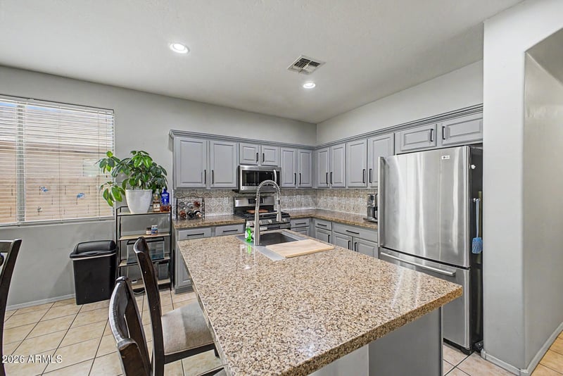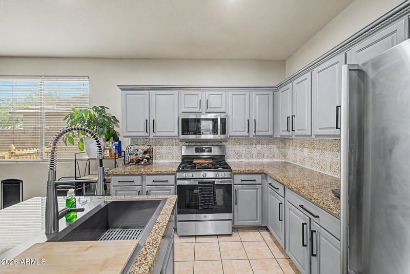 Listing details for 267 152nd Ave, Goodyear, AZ 85338 : Beautiful 4-bedroom, 3-bathroom home plus open den, offering the perfect blend of comfort, style, and functionality. The updated kitchen stands out with professionally painted cabinets, sleek black hardware, a gas stove, and a stylish tile backsplash that adds a modern touch. This home includes two primary bedrooms, each with its own en-suite bathroom--an excellent setup for multi-generational living, guests, or added privacy. Step outside to a generous backyard designed for easy living and entertaining, featuring low-maintenance turf, a dedicated dog run, and a welcoming patio ideal for gatherings or quiet evenings outdoors. The exterior has been recently painted, giving the home a fresh, updated look from the moment you arrive.