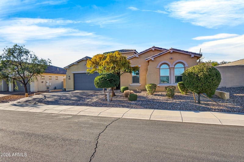 Listing details for 26876 102nd Ln, Peoria, AZ 85383 : Beautifully upgraded single level home backing to a desert preserve in the rapidly growing North Valley near the TSMC semiconductor campus. This well maintained home features plank tile flooring throughout, 8 foot interior doors, and a desirable split floorplan. The spacious kitchen offers a large granite island, gas cooktop, and walk in pantry, opening to a great room with surround sound, separate dining area, and open den with built in Murphy bed. The private primary suite includes a spa style bath with soaking tub, walk in shower, and large walk in closet. Secondary bedrooms are split to the front with three full baths total. Outdoor features include a gated front courtyard with pavers, RV gate, and backyard with custom ramada, fireplace, synthetic turf. Beautifully upgraded single-level home backing to a desert preserve, ideally located in the rapidly growing North Valley corridor near the TSMC semiconductor campus and major economic expansion. Enjoy privacy and open space with a preserve setting that delivers a true Arizona lifestyle.