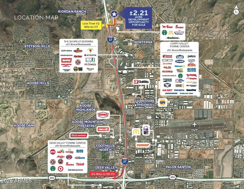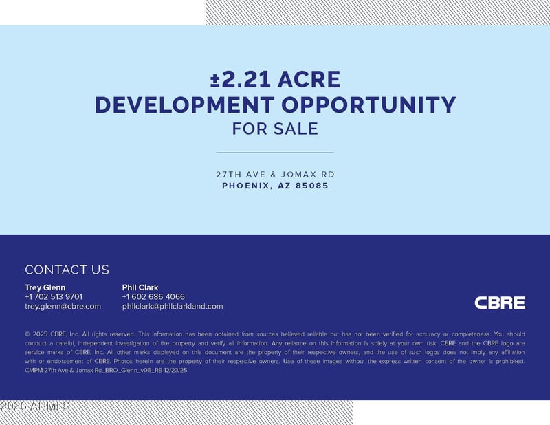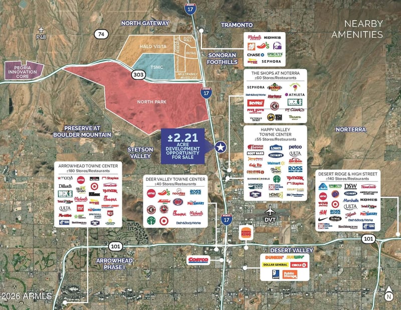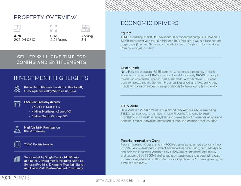 Listing details for 268XX 27th Avenue -- #-, Phoenix, AZ 85085 : This exceptional ±2.2-acre parcel just North of the intersection of 27th Avenue and Jomax Road is strategically positioned in the heart of the North Phoenix growth corridor, one of the Valley's most dynamic and rapidly expanding areas. Surrounded by ongoing residential and commercial development, the site offers potential freeway visibility, great accessibility, and long-term upside. The property benefits from close proximity to major regional employers and economic drivers, including TSMC, USAA, W.L. Gore, and the Deer Valley Air Park, making it ideally suited for a variety of commercial or residential uses. With strong population growth, expanding infrastructure, and increasing demand driven by nearby high-tech and aerospace investment, this location presents a compelling opportunity for investors and developers seeking to capitalize on North Phoenix's continued momentum.