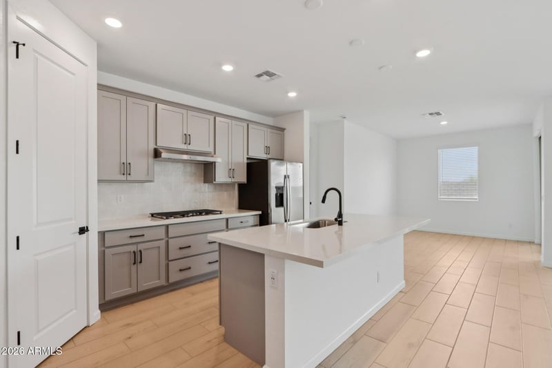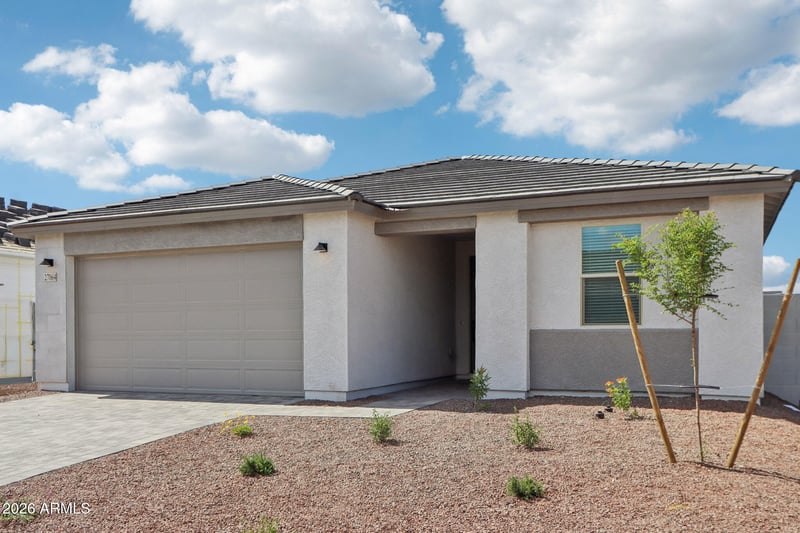 Listing details for 27064 162nd Dr, Surprise, AZ 85387 : This stunning Marigold floor plan offers 1,777 square feet of living space with 3 bedrooms, 2 baths, a Den, and a 2-car garage with a garage door opener. The home features our popular Modern Desert exterior and 8-foot interior doors throughout. The kitchen showcases an Artisan interior collection with a beautiful backsplash, grey 42-inch upper cabinets, stainless steel appliances, and eye catching quartz countertops. The home also includes wood like plank tile flooring, white sand quartz and oval sinks in the bathrooms, and light gray carpeting in the bedrooms. Enjoy a 4-panel center sliding glass door, 2-inch white horizontal faux-wood blinds, a water softener loop system, and a driveway with pavers. Additional conveniences include an washer and dryer and pre-wiring for pendant lights in the kitchen. Located in the gated Visara community in Surprise (163rd Ave & Visara Pkwy) with future amenities including a pool, basketball court, BBQ/picnic areas, tot lot, community trails, and quick access to Loop 303 & Route 60.
