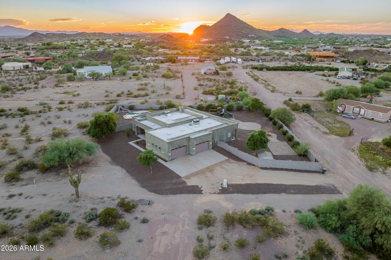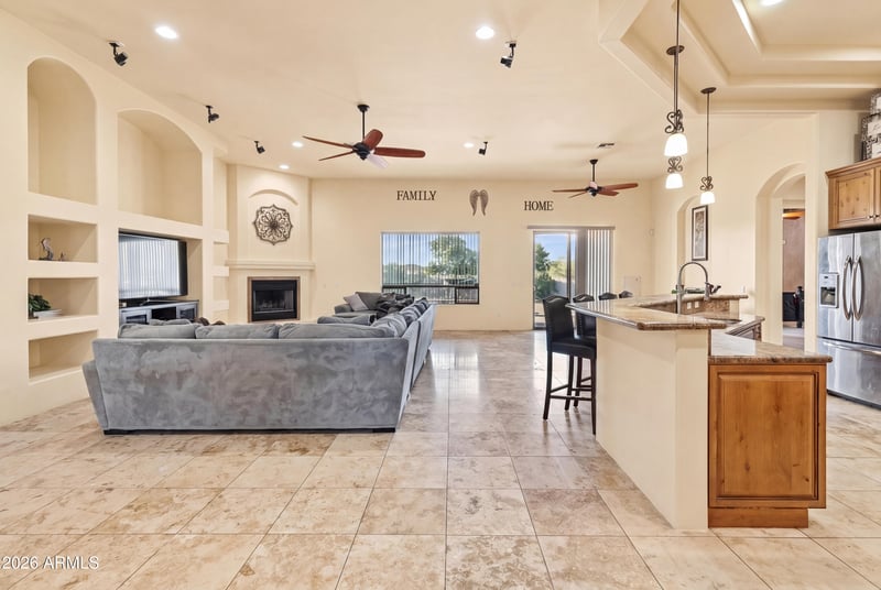 Listing details for 27126 143rd Ln, Surprise, AZ 85387 : Welcome to this stunning custom Territorial/Santa Fe estate set on a full acre with no HOA and breathtaking mountain views! With a rare 6-car garage, solar, a private pool, and RV access, this property truly has it all. Step through the grand entry into an open split floorplan featuring soaring 12' coffered ceilings and elegant travertine flooring throughout. The chef's kitchen is a showstopper -- boasting granite countertops, a large island, double oven, built-in microwave, stainless steel appliances, and a generous walk-in pantry, all framed by rich knotty alder cabinetry that flows seamlessly through the bathrooms as well. Enjoy two master suites, a formal dining room, two fireplaces, and both formal and casual living spaces -- perfect for entertaining or multi-generational living. Relax outdoors on the covered patio or take a dip in the sparkling fenced pool. Horses welcome. This one-of-a-kind home blends timeless elegance with modern functionality -- schedule your private showing today!