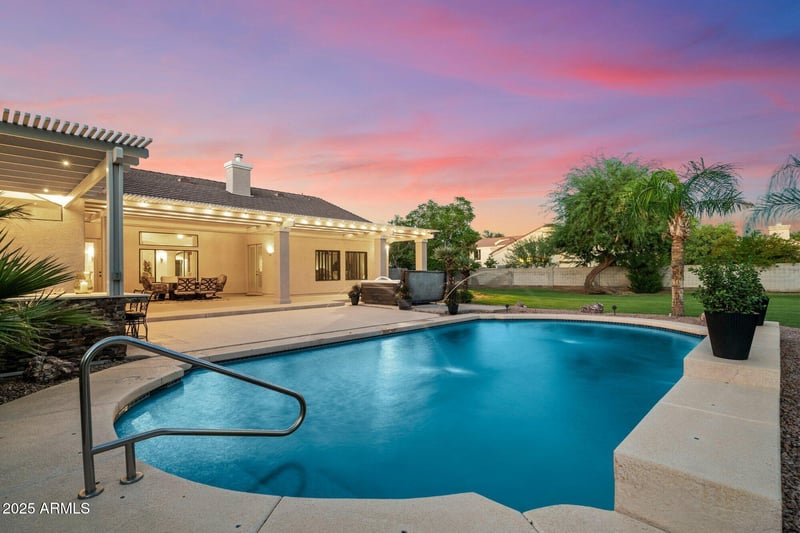 Listing details for 2733 Scorpio Pl, Chandler, AZ 85249 : CIRCLE G CUSTOM HOME-Perfect for Indoor and Outdoor Entertaining. Nestled on over 3/4 Acre. Offering 4 Bedrooms Plus a Bonus Room that can be used as an Office or Flex Space. Luxury Custom Cabinets, Granite Countertops, Travertine Flooring with Mosaic Inlays, Wood Flooring (no carpet), Stained Solid Wood Doors, 2 Cantera Surround Fireplaces, Primary Suite with Stunning Stone Walk-In Shower and Rain Head, Gourmet Kitchen with 36'' Professional Grade Propane Stove, Electric Oven, Wall Oven/Microwave, Wine Fridge, Built-In GE Monogram Fridge, Custom Hood. Enjoy Outdoor Kitchen with Green Egg Smoker, Mini Fridge and Rotisserie Grill, Spacious Patio with Misting System and Pergola. Refreshing Pool with Water Feature, Separate Heated Spa. RV Gate, Spacious Parking, 3 Car Garage with Cabinets. Additional features include Soft Water System, Smart Thermostat, Home Security System and Freshly Painted Interior/Exterior. A Luxury Home Designed for Comfort, Style and Unforgettable Gatherings.