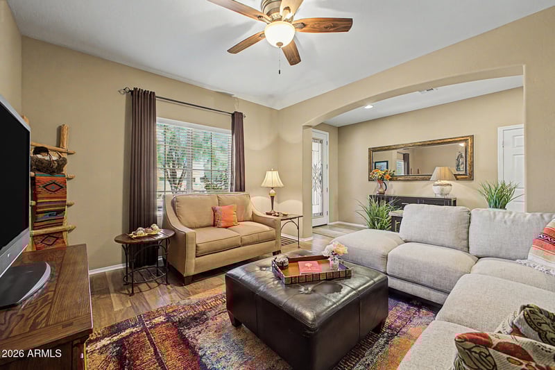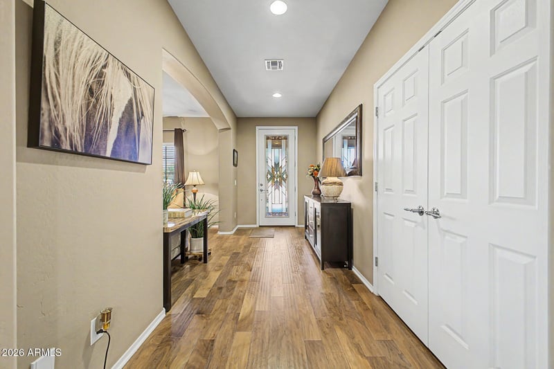 Listing details for 27528 175th Dr, Surprise, AZ 85387 : Located on a premium corner lot, this impeccably maintained and beautifully upgraded home blends luxury with thoughtful design. A decorative glass entry and custom security door welcome you inside to a sought-after floor plan featuring 3 bedrooms, 2 baths, and a separate den. Elegant wood and tile flooring flow throughout. The chef's kitchen showcases upgraded granite countertops, an expanded island, designer pendant lighting, stainless steel appliances, and a walk-in pantry. A custom fireplace wall elevates the dining space, while built-in speakers enhance indoor-outdoor living. The resort-style backyard offers a pergola with bistro lighting, water feature, fire pit, and extensive paver patios. Complete with RV gate, extended-length garage, central vac, and water softener. This is a Gem!