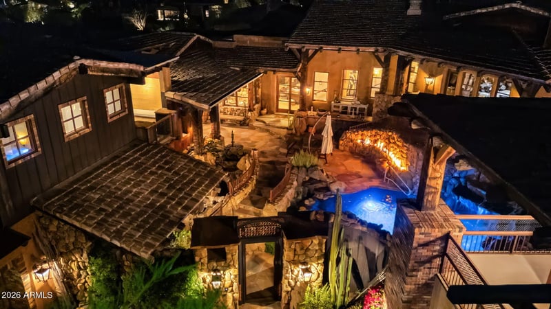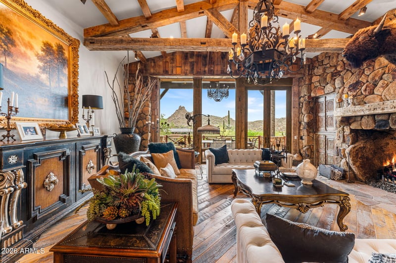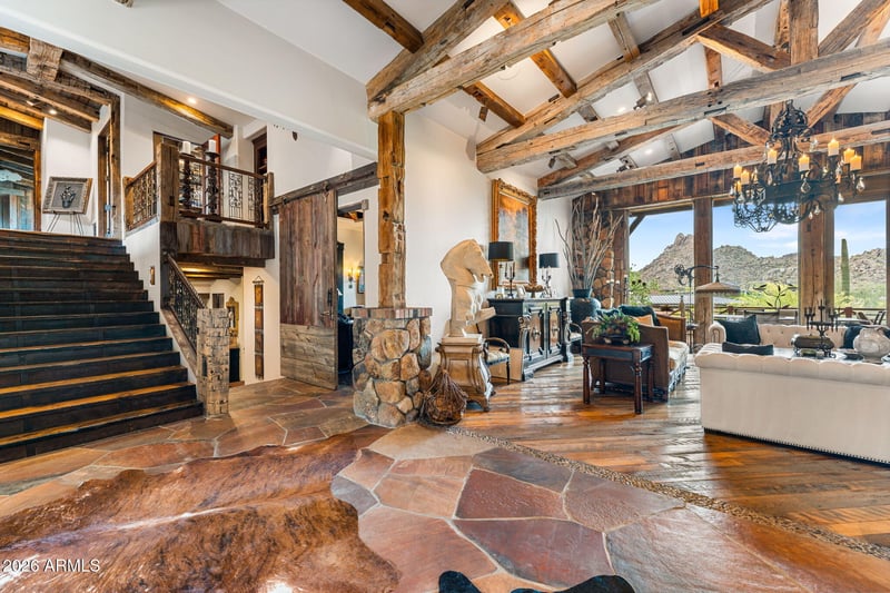 Listing details for 27555 103rd Way, Scottsdale, AZ 85262 : RARE ARCHITECTURE, PINNACLE PEAK VIEWS, DETACHED GUEST HOUSE, & UNMATCHED PRIVACY! Positioned on an elevated mountainside within Estancia, this architecturally distinct residence captures unobstructed Pinnacle Peak views while delivering a level of craftsmanship that is nearly impossible to replicate. Designed with an elegant-rustic lodge aesthetic, the home was constructed using a curated palette of imported and reclaimed materials including 150-year-old barn beams, 100-year-old pine flooring, reclaimed wood siding, rusted corrugated metal, and hand-laid stone masonry. Every element was intentionally selected to create depth, character, and a true sense of permanence. The split floor plan offers dual primary suites, an additional guest suite with private entrance, dedicated office, and an enclosed den/media room. A detached guest house provides its own living area, ensuite bedroom, and loft, positioned along a private walking path with elevated community and mountain views. At the center of the home, a fully enclosed courtyard becomes the focal point - featuring cascading waterfalls, stacked boulders, a bridge over a pebble-lined pool and grotto, Sedona flagstone, and expansive rock fire features. The result is a controlled, immersive indoor-outdoor environment designed for both privacy and experience. Direct access to nearby hiking trails enhances everyday livability, while recent updates including 2020 HVAC systems, newer roof, and updated appliances provide modern reliability. Four garage spaces complete the offering. This is not a home you recreate. It's one you acquire.