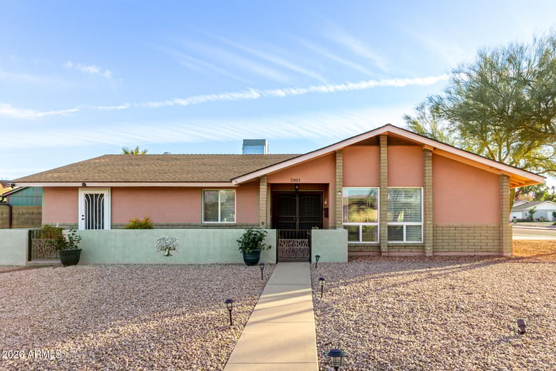 Listing details for 2801 Cortez St, Phoenix, AZ 85028 : Welcome to this lovely well maintained 3 bedroom home with an additional living space with a separate entrance on a large corner lot in Melrose Paradise. This home features a spacious kitchen with a large center island with granite countertops, maple cabinets and self closing drawers & pull out shelves throughout, vaulted ceiling with 2 skylights. The family room has a wood burning fireplace. The main bedroom has an updated ensuite with a barn door plus a door out to the pebble tec pool. There is a bedroom with a separate door that can be used for a home business. Whole house water filtration filtration system. There are 3 large storage sheds on the property. Conveniently located close to 51, hiking trails, restaurants, shopping, and minutes to the new PV mall reimagined!