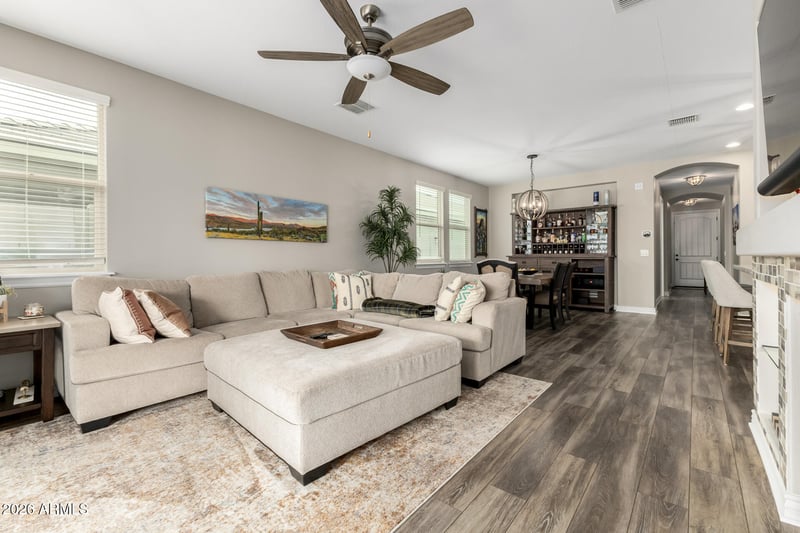 Listing details for 2832 Canada De Oro Rd, San Tan Valley, AZ 85144 : Fall in love with this exquisite home featuring 4 bed, 2 bath & 2car garage. Welcoming front porch perfect for morning coffee. Inside, warm wood-look floors and a soft neutral palette create an inviting atmosphere, while the living and dining area glows with a cozy fireplace for relaxing evenings. The pristine kitchen shines with stainless steel appliances, white cabinetry, granite counters, a stylish tile backsplash, and a center island with a breakfast bar made for gathering. The serene primary suite offers a walk-in closet and a spa-inspired bath with dual sinks and a soaking tub. The backyard is your private retreat with a covered patio, built-in BBQ and a sparkling pool ready for relaxation and fun.Come and experience it for yourself!