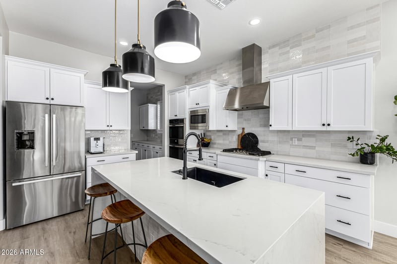 Listing details for 2856 Bloomfield Pw, Gilbert, AZ 85296 : Welcome to your beautiful 3 bedroom + den, 2.5 bathroom home in Warner Groves at Morrison Ranch. Prime location at end of cul de sac on Bloomfield Parkway. Remodeled chef's kitchen with gas range, white shaker cabinets, quartz waterfall countertops, double oven, tile backsplash and oversized walk in pantry. Open concept living with kitchen overlooking great room and backyard space. White shutters, lvp flooring and 5 inch baseboards throughout entire home. Primary suite with marble tile shower, free standing tub and dual vanities. Backyard features extended turf play space, mature ficus trees, gas built in BBQ, gas firepit and pergola. 3 car tandem garage with storage cabinets and polyaspartic floor coating.