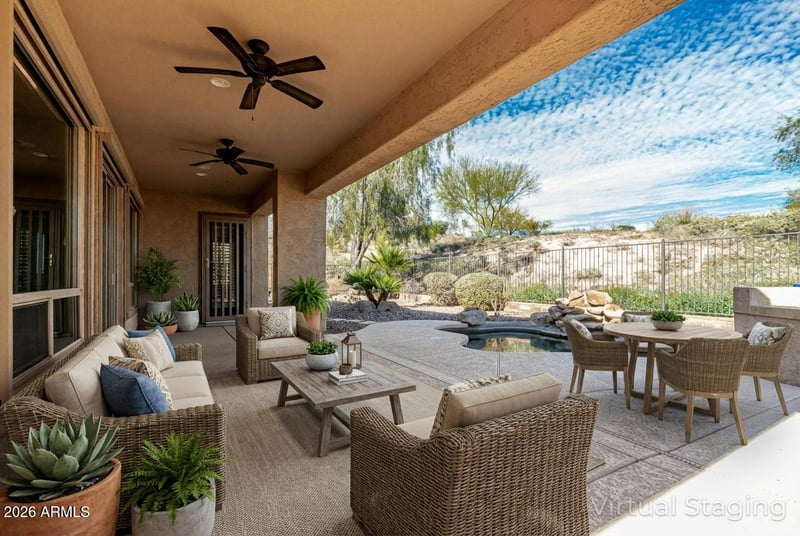 From the moment you arrive, the inviting pavered front courtyard sets the tone for the thoughtful upgrades found throughout. Inside, you'll appreciate the shutters throughout, updated countertops, freshly remodeled primary shower, and rollout kitchen shelves. The spacious primary suite is a peaceful retreat, complete with a private door leading to the back patio—perfect for quiet mornings or evenings taking in the views. The open-concept living area features a cozy gas fireplace, while the backyard transforms everyday living into a true retreat. Enjoy an IN-GROUND SPA, built-in BBQ ISLAND, gas FIREPIT, and a serene WATER FEATURE FLOWING INTO THE SPA. The wide-open backdrop provides gorgeous, ever-changing scenery.