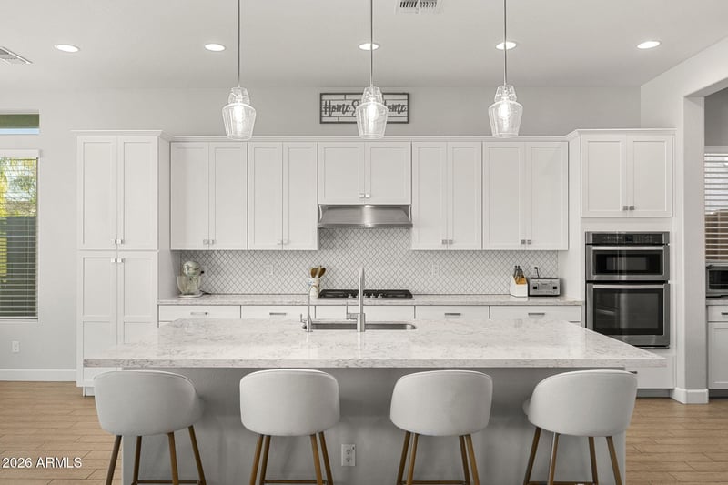 Listing details for 2860 Pinto Dr, Gilbert, AZ 85296 : Thoughtfully crafted single-level residence located in the highly coveted Warner Groves neighborhood within Morrison Ranch in Gilbert. This well-appointed home offers 3 bedrooms with option for 4th bedroom, 2.5 baths, and two versatile flex spaces ideal for a private office, media room, play room or fitness studio. The chef-inspired kitchen blends style and function, featuring upgraded stainless steel appliances with a built-in oven and microwave, gas range, white linen maple cabinetry, granite countertops, tiled backsplash, an expansive island, butler's prep area, and a generously sized walk-in pantry. Designed for both everyday comfort and effortless entertaining, the home showcases 8-foot doors, a desirable split floor plan, and a dramatic multi-slider with remote-controlled electric shades that creates a seamless indoor-outdoor living experience. The resort-style backyard offers exceptional privacy and is highlighted by a covered patio, heated pool and spa with Baja step, travertine decking, artificial turf, a built-in gas BBQ, and no two-story homes behind. Additional features include a paver driveway, walkway, and front porch, upgraded designer lighting, tile shower surrounds in the primary bath, and a premium north/south-facing lotdelivering refined living in one of Gilbert's most sought-after communities.