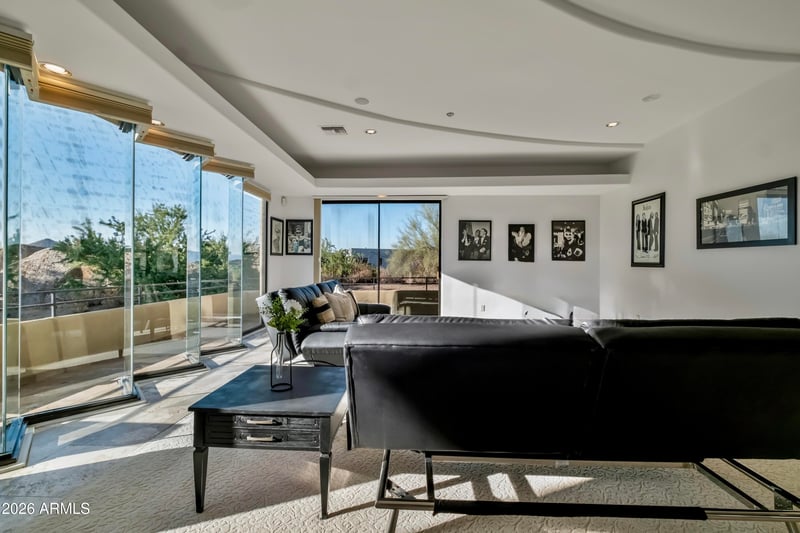 Listing details for 28743 106th Pl, Scottsdale, AZ 85262 : The Belgard pavers of the circular driveway lead up to this contemporary stunner perched high with incredible views. This prime lot at the end of a quiet cul-de-sac offers sweeping panoramic views including Troon mountain, golf course, city light and Sunset. Walking up the stair to the entry with exquisite custom design zigzag Floor to ceiling window. The impressive great room is anchored by a dramatic fireplace and wet bar encapsulate the gorgeous views. Coffered ceilings through out the entertainment room and office. The sleek kitchen offers African Buinga cabinets, 2 fisher paykel dishwashers, stainless steel built-in REF, wall oven and wine cooler. The primary suite invites south and west views of sunrising , city lights and sunset. Glass Fireplace with a peninsula styling that ext