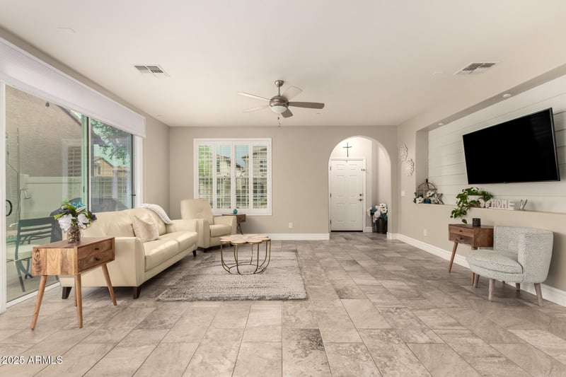 Listing details for 28927 124th Dr, Peoria, AZ 85383 : Discover this gorgeous two-story residence! Featuring 3 bedrooms plus a den, 3.5 bathrooms, and a 2-car garage with attached storage & epoxy flooring. Inside, you'll be greeted with 12x24 porcelain tile flooring through out the first level, arched passageways, abundant natural light, plantation shutters & neutral tones. Whip up your signature dishes in the impeccable kitchen, equipped with staggered cabinets adorned with crown molding, tile backsplash, granite counters, and stainless steel appliances. The main suite boasts a full ensuite with double sinks, his and hers closet, and sliding doors to the balcony. One guest bedroom has a full en-suite bath. The den is perfect for a gaming room or an office. The community offers multiple community pools, sport courts, parks, and clubhouse.