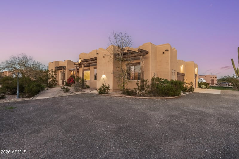 Listing details for 29009 152nd Dr, Surprise, AZ 85387 : Authentic SANTA FE LIVING on a private ACRE with stunning MOUNTAIN VIEWS. SINGLE-STORY custom-built with hand-carved vigas and corbels, WOOD CEILINGS throughout, KIVA FIREPLACE, arched niches, and solid wood doors. Chef's kitchen featuring granite counters, double wall ovens, gas cooktop, and center island opens to great room filled with natural light. Full-length COVERED PATIO, HEATED SPA, and ROOFTOP DECK accessed via SPIRAL STAIRCASE—perfect for Arizona sunsets. Primary suite offers private patio exit, jetted soaking tub, dual vanities, separate shower, and oversized walk-in closet. CORNER LOT. 4-CAR EXTENDED GARAGE with direct access, RV PARKING, 10 slab spaces, and HORSE PROPERTY zoning. NO HOA. Central vacuum. HVAC updated 2024. Minutes from Loop 303.