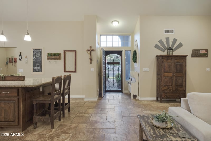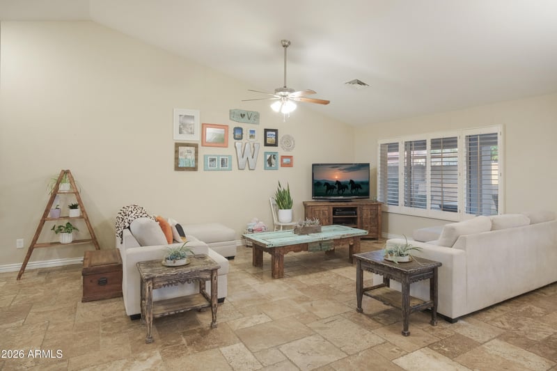 Listing details for 2917 Northridge St, Mesa, AZ 85213 : This beautifully maintained 4-bedroom, 2-bath home offers an open-concept design with soaring vaulted ceilings and a spacious kitchen island-ideal for hosting and everyday living. Rich Noche travertine flooring and new carpet brings a timeless elegance to the main living areas, while wooden shutters throughout add warmth and character, creating a true move-in-ready feel. You'll appreciate the abundant storage, including a large walk-in pantry and an oversized laundry room. The backyard is perfect for both relaxing and entertaining, featuring a full-length covered patio, expansive grass area, and a sparkling pool ready to enjoy. A 3-car garage provides plenty of space for vehicles and storage, plus a large RV gate for all your additional toys. Enjoy peace of mind with major updates already complete including a new roof (2023), updated pool equipment, pool resurfacing, one AC unit replaced in (2021) and new carpet (2026). With no HOA, this home offers both comfort and easy living.