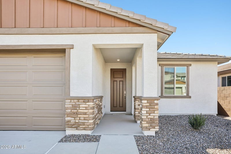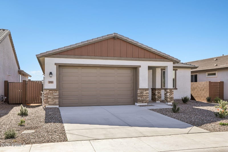 Listing details for 2933 Mecklenburg Way, San Tan Valley, AZ 85143 : Brand-new 4 bed, 2.5 bath home in Bella Vista Farms! Open-concept design with 8' doors, burlap cabinets, white granite countertops, and a beautiful kitchen backsplash. Features include upgraded finishes, 12x24 tile with carpet in bedrooms, and a garage service door. Enjoy community amenities—pool, splash park, playgrounds, basketball, volleyball & soccer—plus a convenient location near San Tan Mountain Park, Queen Creek Marketplace & schools.