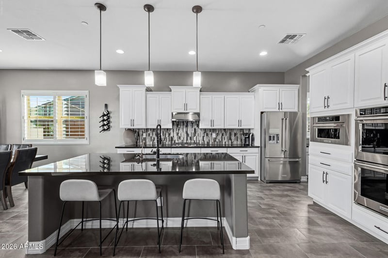 Listing details for 29707 118th Dr, Peoria, AZ 85383 : This home exudes pride of ownership! This one of a kind home has it all. Stunning interior w/ tile flooring, 4'' plantation shutters, recessed lighting, surround sound. The living room flows into the family room w/ a cozy fireplace & built-in media niche. The kitchen features SS appliances, granite counters, a center island w/breakfast bar, tile backsplash, staggered cabinetry w/crown moulding, a butler's service area, & a walk-in pantry. The luxurious main suite w/ a lavish bathroom offering a dual sink vanity w/makeup area, tiled shower, & walk-in closet. A sparkling pool w/ a custom built pergola, sunken BBQ lounge & a swim up pool bar. PAID off solar panels, BEST PART- 5 car garage w/ a 900 sq ft addition that could be used for a man cave, gym, mutli gen casita, endless possibilities! Additional highlights include a functional mudroom & a well-equipped laundry room w/cabinetry & stacked washer/dryer. The attached casita is perfect for guests or multi-generational living, including its own open living space, kitchenette, walk-in closet/pantry, & full bathroom. Serene backyard has multiple seating areas, a fire pit, a sparkling blue pool, Ramada w/sunken built-in BBQ, & covered patio. This remarkable property is sure to sell fast!