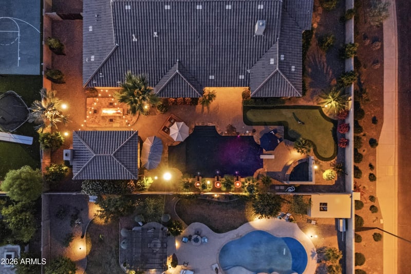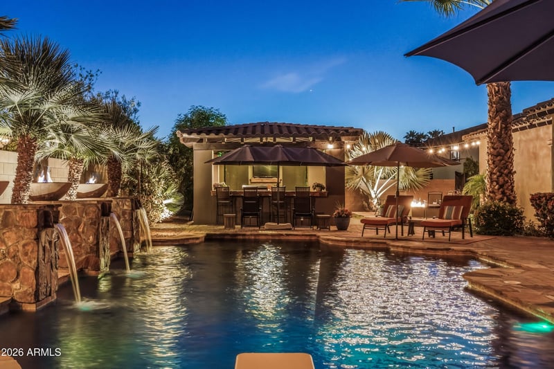 Listing details for 2971 Oriole Dr, Gilbert, AZ 85297 : Welcome to your private oasis in the Stratland Shadows community of Gilbert. This exquisite single story residence perfectly blends sophisticated luxury with functional design, featuring a desirable split floor plan with 4 bedrooms and 3.5 baths. Also featuring a versatile flex space that provides the perfect retreat for work or play. The interior transitions seamlessly to a backyard masterpiece designed for world-class entertaining. Immerse yourself in the large sparkling pool and spa, sharpen your game on the putting green, or gather around the custom firepit. The massive ramada serves as an outdoor living room, complete with a built in BBQ and TV setup. Whether hosting fun soirées or enjoying the Arizona sunsets, this home offers an unparalleled lifestyle on a premium corner lot!