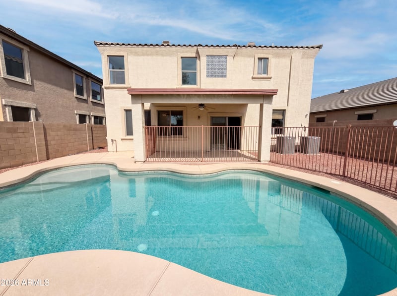 Listing details for 2993 160th Ln, Goodyear, AZ 85338 : Explore an arrangement built for everyday practicality at 2993 S 160th Ln, providing a functional layout. The kitchen features an island and all stainless steel appliances. The primary bathroom includes double sinks, a separate tub, and a shower. A walk-in closet is provided in the primary bedroom. Outdoor living extends to a covered patio and an in-ground pool, all within a fenced backyard. Discover balanced living with comfort and recreation.. Included 100-Day Home Warranty with buyer activation