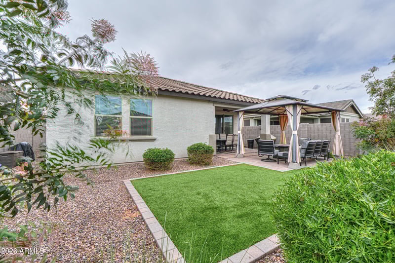 The private primary suite offers a barn door entry to a spa-inspired bath with a large walk-in shower, dual shower heads, and separate controls. The open great room flows into a modern kitchen with quartz countertops, gas range, and sleek finishes--ideal for entertaining. Upgrades include blown-in insulation, tankless water heater, built-in Murphy bed, elongated toilets, and a 2-car garage. Enjoy outdoor living with a low-maintenance backyard, gazebo, covered patio, and inviting front courtyard Community amenities include walking trails, playgrounds, ramadas, sports courts, and a resort-style pool.
