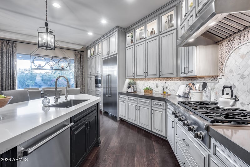 Listing details for 3057 Sousa Ct, Anthem, AZ 85086 : Resort-style living in the heart of Anthem. This beautifully upgraded home features custom built-in cabinetry throughout the office, wine room, and laundry (with dedicated refrigerator space), all with soft-close construction. The chef's kitchen is a standout, offering a built-in Thermador refrigerator, full Thermador appliance package, real wood dovetail drawers, full lower-drawer configuration, and premium finishes. Custom closets are included in the primary suite and secondary bedrooms. Additional upgrades include a whole-home reverse-osmosis water filtration system and a tankless water heater with recirculation pump. Front yard was remodeled in Dec of 2022 with new drip system installed. Garage is fully insulated and added radiant barrier in attic ceiling to help with heat. Surround sound in living room, media room and speakers throughout the house and backyard. The finished garage was completed in 2025 and showcase epoxy flooring, a modern HandyWall organization system floor to ceiling on all walls with high-quality cabinetry. Step outside to your private backyard oasis featuring a sparkling pool, covered patio, gazebo, raised garden beds, and a large storage shed on a concrete slab. Entertain with ease using the natural gas fireplace, Alpha pizza oven, and high-end Lynx infrared grill, all while enjoying subtle mountain views. Located on a quiet cul-de-sac surrounded by single-story homes on oversized lots (approximately one-third acre), this property offers exceptional privacy and space. Residents enjoy access to Anthem's top-rated amenities, including a community center with water park and dive pool, private main park with splash pads, playgrounds, sports fields, and miles of walking, hiking, and mountain biking trails. A rare opportunity that blends luxury upgrades, indoor-outdoor living, and an unbeatable Anthem lifestyle.