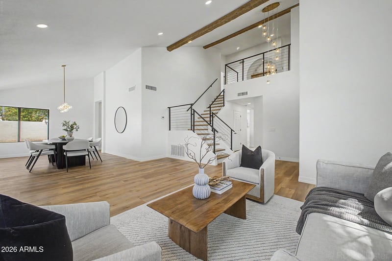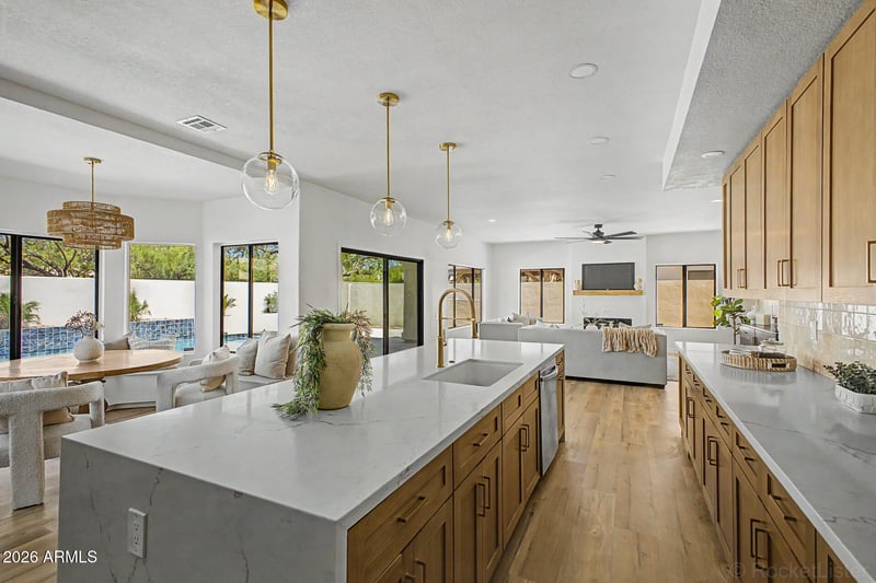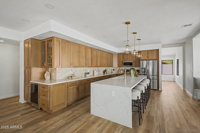 Listing details for 30641 41st Way, Cave Creek, AZ 85331 : This impeccably renovated & re-designed residence is a refined jewel box offering elevated design,exceptional workmanship,and effortless livability. Every detail has been thoughtfully curated with a level of finish and care rarely found at this price point, creating a truly turnkey home.The well balanced split layout includes 5 bedrooms (with 1 bedroom on main level),and 3 full baths,blending sophistication with functionality. A re-imagined chefs kitchen anchors the home with 42'' white oak cabinetry, massive quartz countertop waterfall island,mini fridge, and Wraparound window bench nook,the perfect dining alcove.Spa-inspired primary bath with large-format floor to ceiling tile,herringbone mosaic floor, built-in niche,and a walk-in shower with stand alone soaking tub with natural light.Dr Dramatic living room with linear electric fireplace,and rustic white oak mantel.Arched dry bar/niche with custom cabinetry.