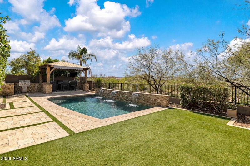Listing details for 30910 26th Ave, Phoenix, AZ 85085 : Set on a quiet arroyo lot in Sonoran Commons, this home offers the kind of privacy that is hard to find, with no neighbors behind and sunset views that become part of your daily routine. Custom iron entry doors open to a spacious layout with a private guest suite and dedicated office with double doors. The kitchen features Monogram appliances, a built-in Thermador refrigerator, butler's pantry, and walk-in pantry, all open to the main living areas. Out back, evenings unfold around the pool with water features, fire pit, and outdoor kitchen beneath the gazebo, with layered outdoor spaces designed for evenings, entertaining, and enjoying the desert setting. Ideally located near I-17 with convenient access to shopping, dining, and nearby trails. Some homes are better experienced in person!