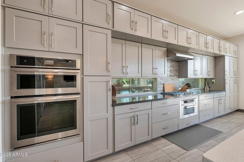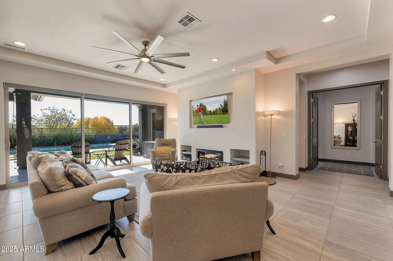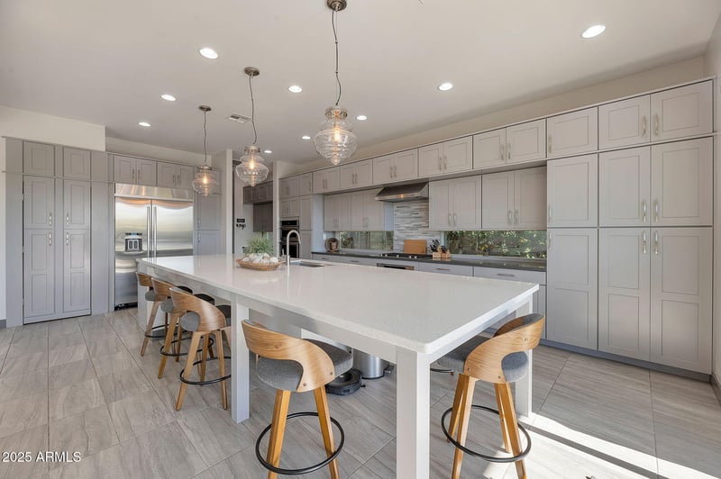 Listing details for 3119 Cat Balue Dr, Phoenix, AZ 85050 : Modern sophistication meets superb location! This highly upgraded 4BR/3.5BA home is situated on a premium view lot, backing to community park and greenbelt. Features include large great room with linear fireplace, with a wall of windows opening up to backyard. Large kitchen with island, plentiful cabinet space, quartz counters, custom stainless appliances including gas cooktop and built-in refrigerator plus walk-in pantry. Home decorated in a modern color palette, including custom tile throughout, neutral paint (repainted in 2025), modern lighting, and motorized blinds. Wonderful, open floor plan with dual closets in master, stunning primary bath, plus one en-suite bedroom bath - perfect for guests! Backyard is entertainer's paradise, complete private pool, hot tub, and firepit. Home also has OWNED solar! All of this, in an elegant gated community, close to Desert Ridge shopping, award-winning schools, and Loop 101 and 51 freeways! Home shows beautifully and pride of ownership is evident!