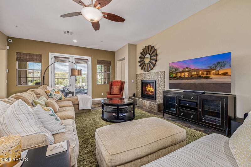 The great room, anchored by a TILED GAS FIRPLACE, opens through three sets of patio doors to both the courtyard and backyard -- creating seamless indoor-outdoor living.