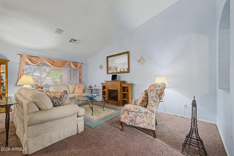 Listing details for 3159 Couples Dr, Goodyear, AZ 85395 : Discover the home you've been waiting for, situated on a premium lot backing a beautiful park! This popular Topaz model offers 2 bedrooms plus a den and 6 foot extension. It provides the perfect blend of comfort and style. Step inside to find a spacious, light-filled interior featuring new vinyl and wood flooring. The heart of the home is the stunning kitchen, thoughtfully designed with cabinets extended into a generous eat-in area complete with a charming bay window. A chef's delight, the kitchen is equipped with a gas cooktop, newer stainless steel appliances, convenient wall ovens, gleaming quartz countertops, a breakfast bar, custom pull-out shelving. The huge owner's suite is.is a private retreat, featuring its own bay window, a separate exit to the patio, an oversized shower, and... a large walk-in closet. Guests will feel right at home in the large second bedroom, which includes a window seat and its own spacious walk-in closet. Your private, resort-style backyard is an entertainer's paradise, where an extended covered patio provides ample space for gathering, while the bee-hive fireplace and built-in BBQ create the perfect ambiance for Arizona living. This exceptional property is loaded with upgrades, including solar tubes for abundant natural light, surround sound throughout with volume controls, hot water recirculation pump, solid concrete block construction, 4 foot extension on the front of the home, security screen doors throughout, a water softener system, sunscreens, overhead garage storage racks, a dedicated garage service door to gated sideyard with wall fountain, upgraded PVC irrigation, and ample parking with space for a golf cart. This home offers a rare combination of luxury, location, and lifestyle. Sellers will provide a paint allowance at close of escrow!