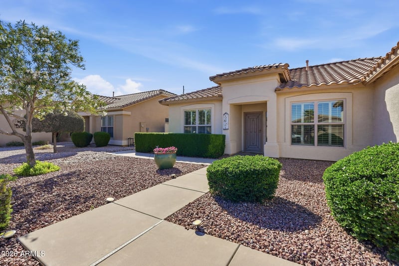 Listing details for 3161 Gleneagle Dr, Chandler, AZ 85249 : This Saguaro floorplan - 3beds, 2baths with a den. Step inside to an inviting open layout featured around a gas fireplace. The kitchen has granite countertops, and flows into the main living areas, perfect for gatherings.. The primary suite is complete with a custom closet, dual sinks, a soaking tub, and a separate shower. Plantation shutters in the front and no carpet throughout! Covered patio in the backyard and a refreshing pool featuring a variable speed pump and a cascade water feature. No neighbors directly behind you and beautiful mountain views. Additional highlights include a 2-car garage with built-in cabinets plus utility sink, reverse osmosis, whole-home filtration, and soft water systems for added convenience and peace of mind. Located in the 55+ neighborhood of Solera.