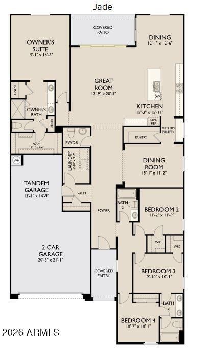 Listing details for 32021 Lone Rancher Way, San Tan Valley, AZ 85140 : Introducing the beautifully designed Jade Plan featuring 4 bedrooms, 3.5 baths, and a spacious 3-car tandem garage. This thoughtfully designed split floor plan offers both privacy and functionality, ideal for modern living. The heart of the home showcases the Harmony Collection interior color package, highlighted by elegant white 42'' shaker cabinets, complementary finishes, and a classic, warm palette that blends seamlessly with any style. The open-concept layout flows effortlessly into a separate dining room, while the well-appointed kitchen features a convenient butler's pantry and a large walk-in pantry, providing exceptional storage and prep space, perfect for entertaining. The private primary suite is tucked away from the secondary bedrooms, creating a serene retreat. With elegant finishes, abundant storage, and a versatile 3-car tandem garage, the Jade Plan offers the perfect balance of style and practicality.
