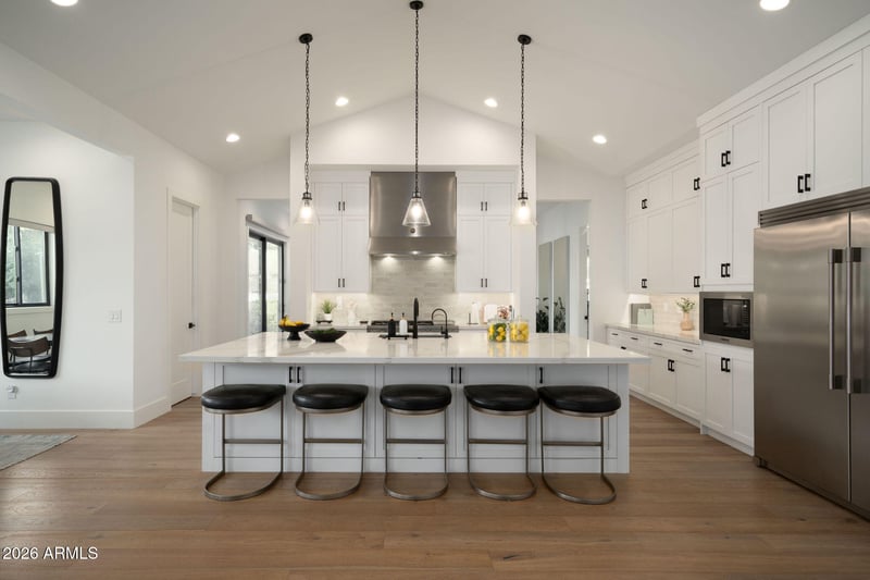 Listing details for 3226 Glenrosa Ave, Phoenix, AZ 85018 : Experience elevated Arcadia Lite living in this impeccably designed modern organic residence, set within one of the area's most coveted neighborhoods. This exceptional home offers 5 bedrooms and 4.5 baths of thoughtfully curated living space, including a fully appointed guest casita.Designed for effortless entertaining and everyday elegance, the open concept floor plan is anchored by a chef's kitchen featuring premium stainless steel appliances, sleek quartz countertops, and an oversized statement island. The living area captivates with soaring vaulted ceilings, a designer fireplace, and expansive windows that flood the home with natural light. A versatile bonus room offers flexible living space and opens to a private patio for seamless indoor-outdoor enjoyment. The grand primary suite serves as a serene retreat, complete with a spa inspired bath showcasing a freestanding soaking tub, a walk-in shower, and an expansive closet. Additional bedrooms are generously sized, offering comfort, versatility, and ample storage throughout. The private guest casita offers a separate entrance and includes a living area with kitchenette, a spacious bedroom, a full bathroom, and laundry hook-ups. This is ideal for a quiet office, guests or multigenerational living. Step outside to a private resort style backyard oasis, enhanced by lush, mature landscaping, a covered patio, a large sparkling swimming pool with an expansive Baja shelf, and a built-in BBQ that is perfect for refined entertaining or peaceful relaxation in a tranquil setting.