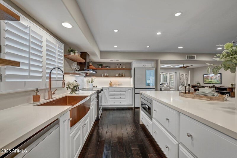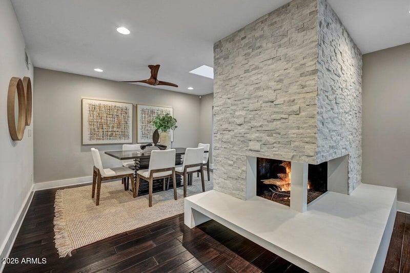 Listing details for 3307 Terrace Rd, Tempe, AZ 85282 : Rare, refined Tempe gem, this mid-century contemporary home boasts over $300K in design-forward upgrades. Clean lines meet warm finishes with rich wood flooring, recessed lighting, & a stacked-stone fireplace. Kitchen offers a waterfall-edge quartz island, custom cabinetry, open shelving, copper farmhouse sink, under-cabinet lighting, & sleek white glass smart appliances. Flex sunroom is ideal for office, media, or game room space. Resort-style backyard with diving pool, turf, mature landscaping, & custom charred wood privacy wall. Standing seam metal roof adds modern appeal with long-term durability. Open layout with abundant light from 13 skylights & recessed lighting. A private retreat that blends sophisticated design with effortless indoor-outdoor living in a prime Tempe location.