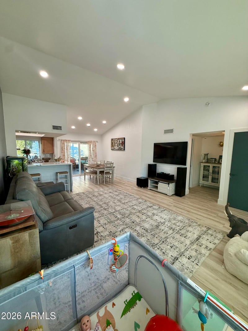 Listing details for 3318 Taro Ln, Phoenix, AZ 85050 : Beautifully upgraded single-level home with modern finishes, vaulted ceilings, and a bright open layout. Fresh exterior paint adds crisp curb appeal, complemented by low-maintenance desert landscaping and an attached 2-car garage. Inside, stunning new flooring flows throughout, creating a seamless contemporary feel. Spacious living areas feature recessed lighting and soaring ceilings. The upgraded kitchen offers granite countertops, stainless steel appliances, breakfast bar seating, and ample cabinetry. The primary suite has new flooring and direct patio access. Renovated bath includes a marble-style vanity, updated fixtures, and tiled walk-in shower. Additional highlights: new windows, AC (01/21/26), plantation shutters, split AC in office, updated lighting. Turnkey and ready to move in.